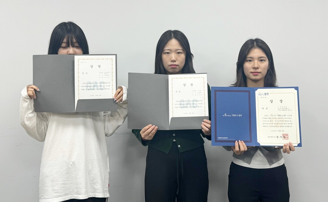 이번 공모전에서 박아인 학생은 ‘카멜레온 놀이터’란 작품으로 대상(광주광역시장상)의 영예와 함께 상금 100만원을 수상했고, 김민서 학생(1학년)은 ‘五.18感’이란 작품으로 은상과 상금 20만원을, 오수민 학생도 ‘Smart Safety Station’ 이란 작품으로 입선의 영예를 안았다.