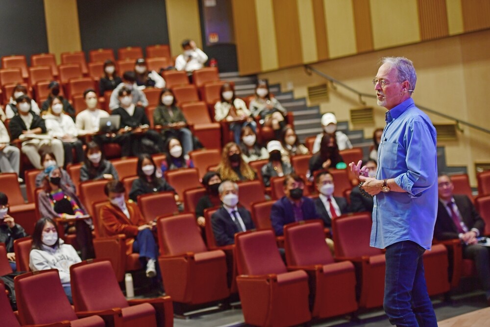 샘 리처드 미국 펜실베이니아주립대 교수가 지난해 10월 건국대 프라임홀에서 ‘한류의 지속력’을 주제로 특강을 하고 있다. 사진=건국대 제공 |