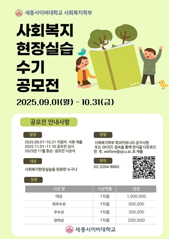 [대학저널 온종림 기자] 세종사이버대학교 사회복지학부는 사회복지 현장실습을 완료한 누구나 참여할 수 있는 ‘사회복지 현장실습 수기 공모전’을 개최한다.