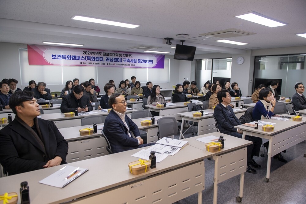 [대학저널 온종림 기자] 대구보건대학교가 22일 영송관 1318호 스마트 강의실에서 ‘2024학년도 글로컬대학30 프로젝트 1차년도 대구보건특화캠퍼스 구축사업 중간보고회’를 성황리에 마쳤다. 이번 보고회는 보건의료산업 기술인력 양성을 목표로 한 ‘현장 미러형 러닝센터’와 ‘지역보건의료산업 연계형 특화센터’ 구축 사업의 진행 상황과 성과를 공유하고, 향후 발전 방향을 논의하기 위해 마련됐다.