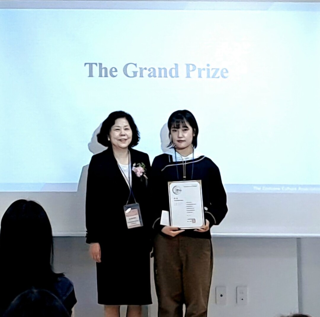 ‘제1회 크리에이티브 패션 디자인 콘테스트’애서 대상을 수상한 윤지수 학생(오른쪽)이 기념촬영을 하고 있다. 사진=대구대 제공 |