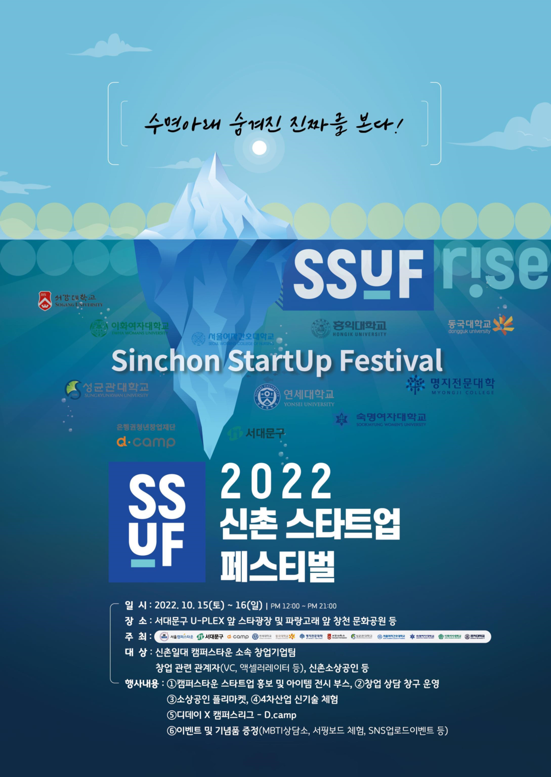 연세대와 서강대, 성군관대 등 도심 서북권 캠퍼스타운 9개 대학 등이 함께하는 ‘2022 SSUF’는 최초로 민관학 협업으로 열린다. 행사에서는 ㄴ창업뿐만 아니라 지역 경제 활성화를 위한 ▲소상공인 플리마켓 ▲4차 산업 신기술 체험부스 ▲스타트업 CEO 특강 ▲SNS(사회관계망서비스) 이벤트 등이 운영될 예정이다.