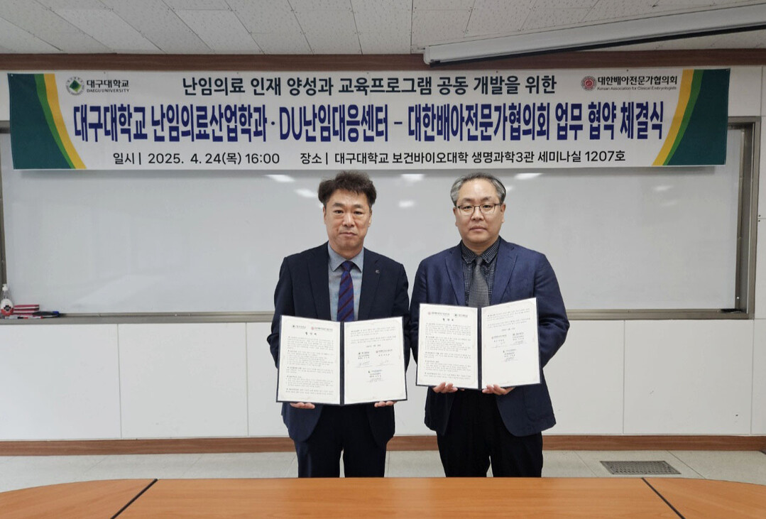 [대학저널 이선용 기자] 대구대학교는 지난 4월 24일 경산캠퍼스 보건바이오대학 세미나실에서 난임의료산업학과, DU난임대응센터, 대한배아전문가협의회 간의 3자 간 업무협약을 체결했다고 25일 밝혔다.