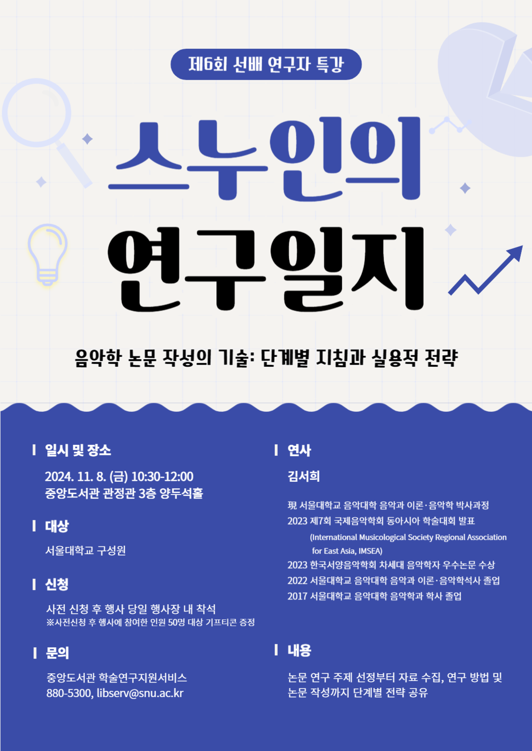 ⌜스누인의 연구일지⌟는 전문 연구역량과 경험을 지닌 서울대 졸업 연구자를 강연자로 초청하여 학문 주제 분야별 논문작성법과 학습법 등을 공유하는 행사이다. 데이터 사이언스 연구자를 초빙하여 진행한 제5회 특강에 이어 이번 강연에서는 음악학 분야로 저변을 넓혀 학내 우수 연구자의 생생한 연구 경험과 노하우를 공유하는 자리를 마련하고자 한다.