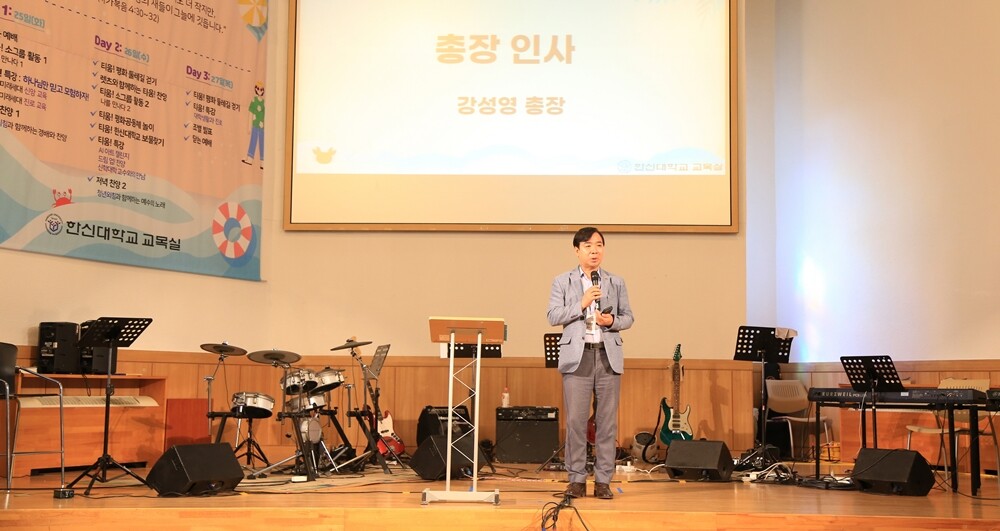 강성영 한신대 총장이 ‘2023 티움! 한신청소년 여름캠프’에서 환영사를 하고 있다. 사진=한신대 제공 |