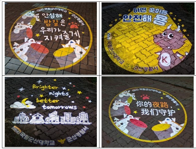 특히, 로고젝터에 삽입될 메시지와 이미지는 학생들에게 친근하게 다가갈 수 있도록 군산대 재학생을 대상으로 진행된 디자인 공모전을 통해 선정됐다. 공모전에서 총 18개의 작품이 선정됐고, 학생들이 안전감과 소속감을 느낄 수 있는 다양한 메시지를 담고 있다. 또 선정작 일부는 외국 유학생을 위해 영어, 중국어, 베트남어로 번역돼 4구 로고젝터로 투사됐다.