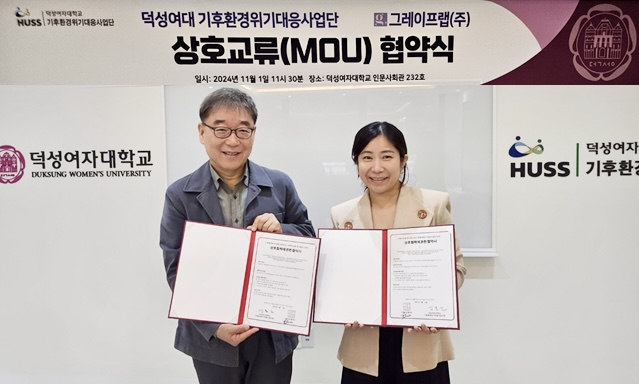 [대학저널 이선용 기자] 덕성여자대학교 기후환경위기대응사업단은 11월 1일 오전 11시 30분 덕성여대 인문사회관에서 ㈜그레이프랩과 기후환경 위기 대응 협력관계 구축을 위한 업무협약을 체결했다.