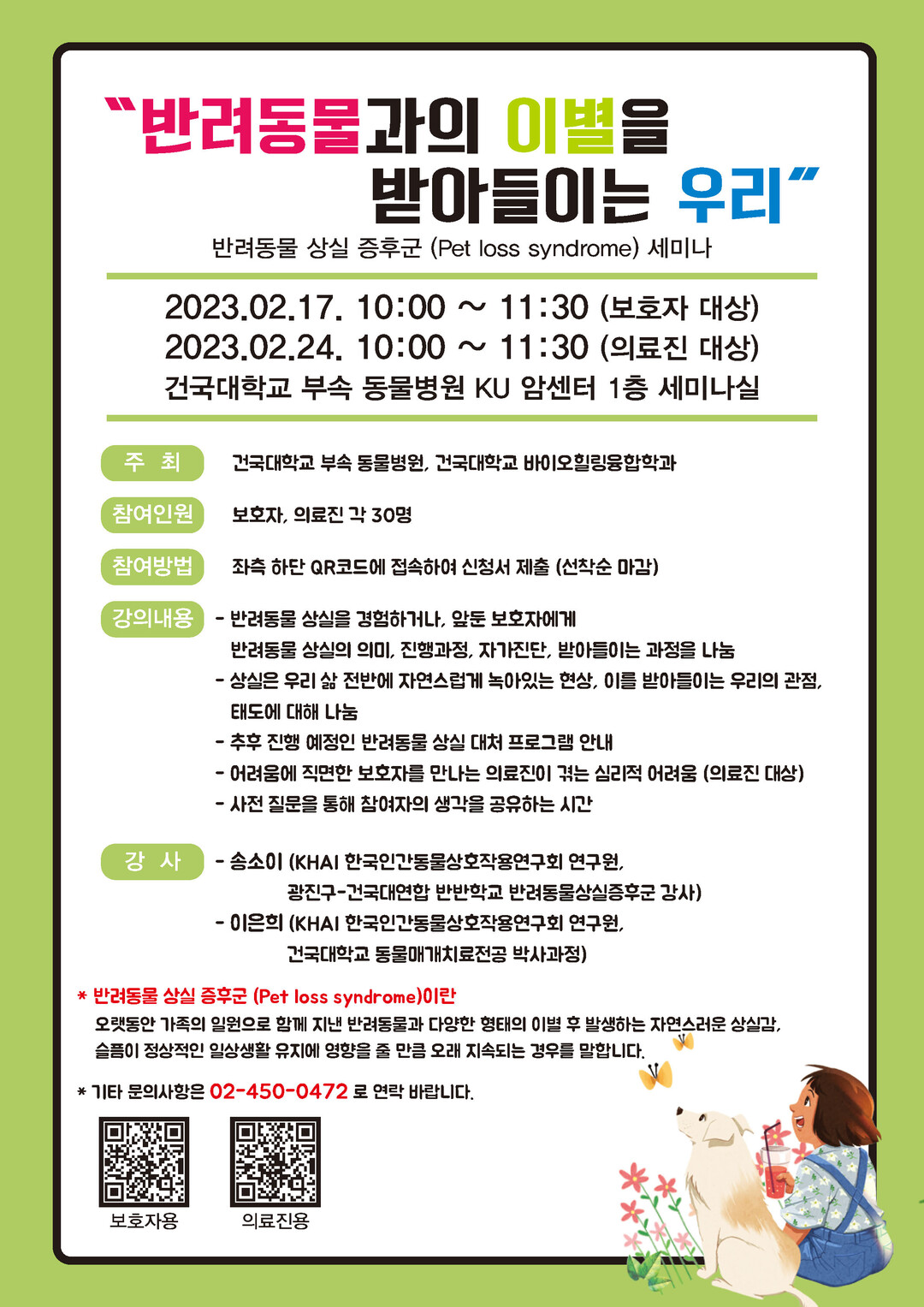 24일에는 동물병원 의료진을 대상으로 어려움에 직면한 보호자를 만나는 심리적 어려움도 다룰 예정이다.