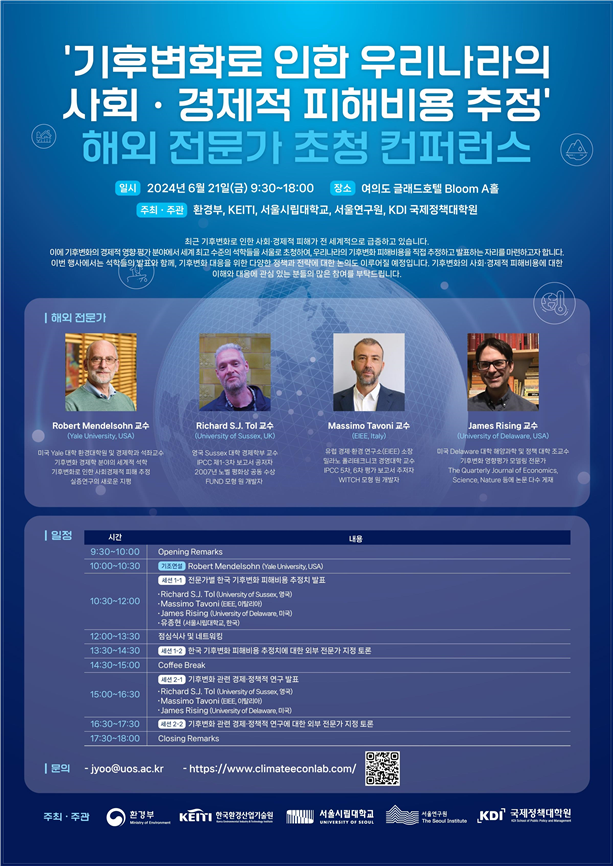 서울시립대 유종현 교수가 해외 전문가들과 함께 기후변화 피해비용 추정 결과 발표를 하며, 이어 서강대 정국모 교수, 서울시 탄소중립지원센터 유정민 센터장, KDI 공공투자관리센터 김현석 실장 등 국내 전문가들이 한국 기후변화 피해비용 추정 결과에 대해 토론한다.