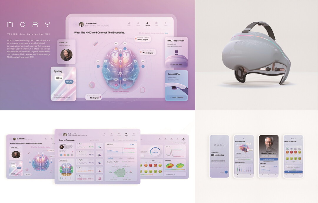 정정호 교수팀은 ‘MORY-MCI 케어서비스 UI(MORY - MCI Care Service UI)’로 경도인지장애(MCI) 환자의 뇌파(EEG)를 분석해 맞춤형 치료와 관리 서비스를 제공하는 가상현실(VR) 기반의 통합 케어솔루션을 선보였다.
