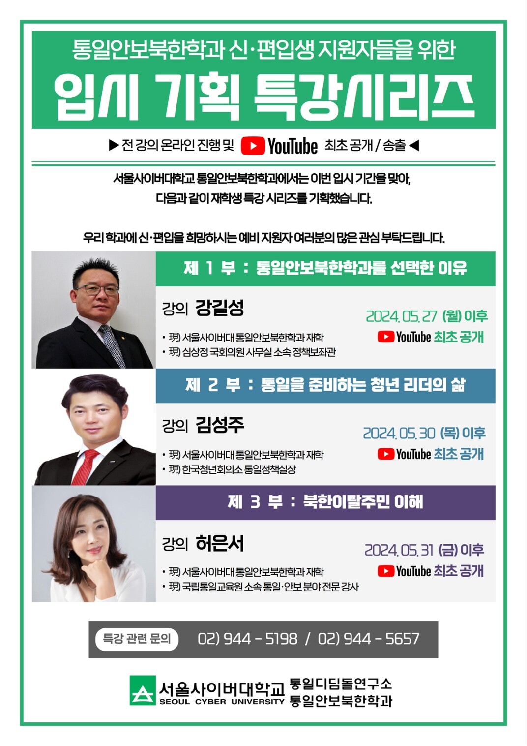 강의는 총 3부로 진행된다. 제1부는 ‘통일안보북한학과를 선택한 이유’ 의 주제로 강길성(현 심상정 국회의원 사무실 소속) 정책보좌관이, 제2부는 '통일을 준비하는 청년 리더의 삶'의 주제로 김성주 한국청년회의소 통일정책실장이, 제3부는 ‘북한이탈주민 이해’의 주제로 허은서 국립통일교육원 소속 통일·안보 분야 전문강사가 강의를 맡았다.