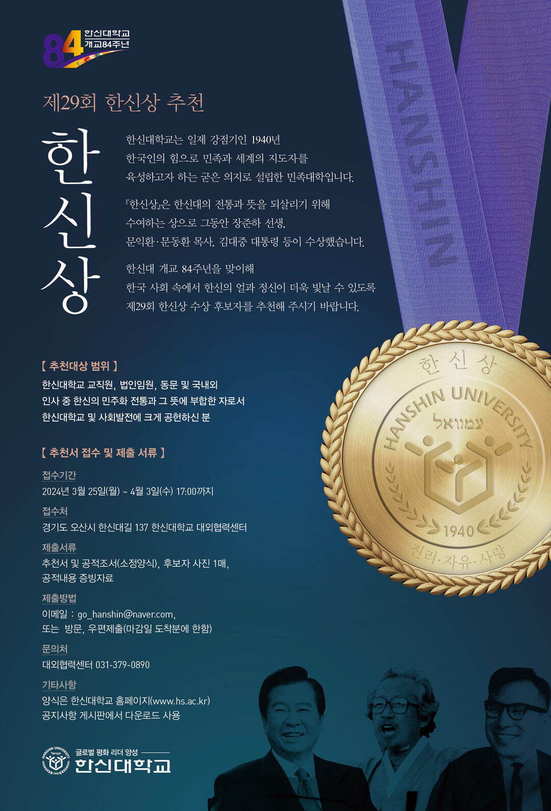 추천은 한신대 홈페이지 공지사항 ‘제29회 한신상 후보 추천 안내’ 게시글에서 추천서 및 제출 서류를 내려받아 작성하고, 이메일, 방문 또는 우편으로 제출하면 된다. 한신상에 대한 문의는 대외협력센터로 하면 된다.