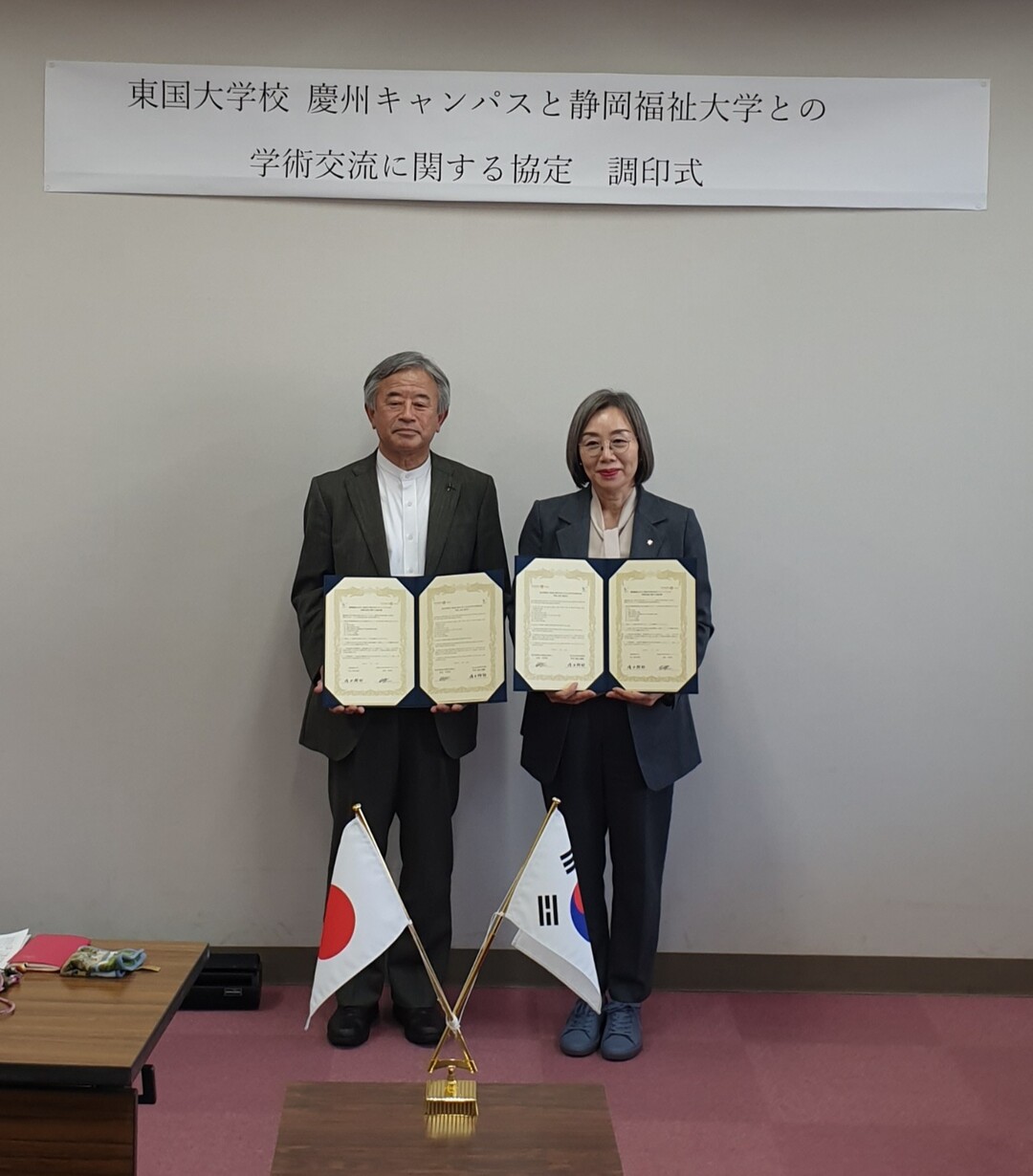 | 이영경(오른쪽) 동국대 wise캠퍼스 총장이 일본 시즈오카대학교에서 양 대학간 양해각서를 체결하고 기념촬영하고 있다. 사진=동국대 제공 |
