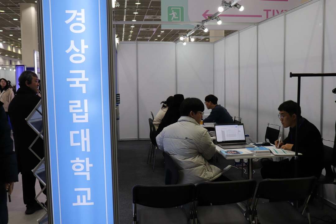 사진은 경상국립대학교 부스에서 입시 상담을 받고 있고 있는 수험생들의 모습이다.