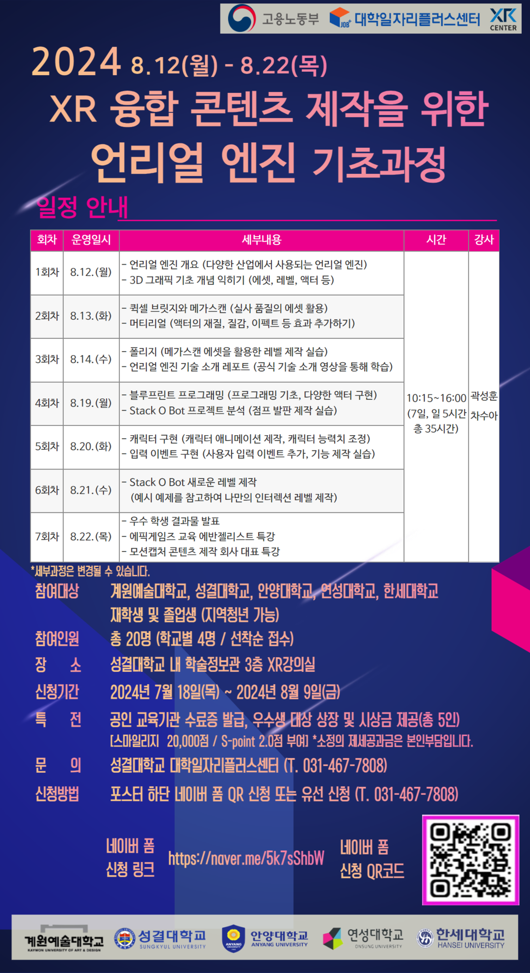 교육 일정은 매일 오전 10시 15분부터 오후 4시까지 진행되며, 마지막 날에는 우수 학생 결과물 발표와 에픽게임즈 교육 에반젤리스트 특강이 포함된다. 수료자에게는 공인 교육기관 수료증 발급, 우수 학생 대상 시상금 및 상장(총 5인) 등이 제공된다.