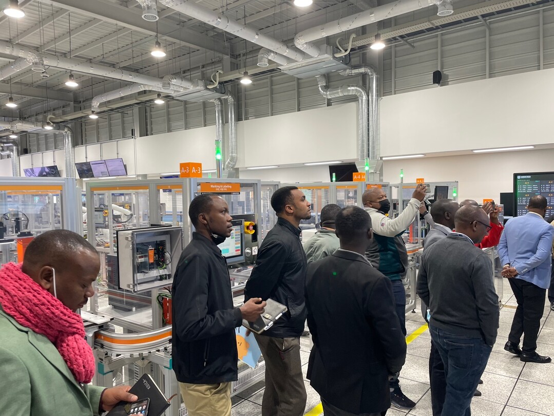 한국기술교육대 초청 연수에 참가하고 있는 르완다 연수단이 K-팩토리 현장을 견학하고 있다. 사진제공=한국기술교육대 |