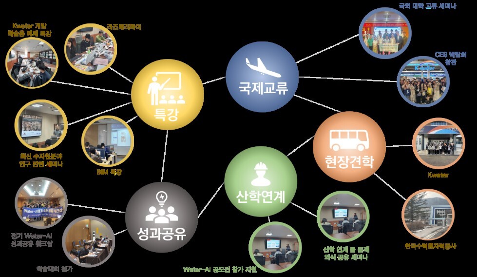 또한 기존 건설시스템공학부의 ‘기후변화수자원방재’ 교과목과 디지털 분야 전공인 인공지능학부의 ‘머신러닝기초’ 교과목을 팀팀클래스로 운영하여 물관리 도메인 전공인 건설시스템공학부 학생과 디지털 전공인 인공지능 학부 학생에게 디지털 관련 분야의 전문지식을 강수량, 하천 또는 저수지 수위, 하천 유량 등 기존 물 분야 관측 빅데이터에 적용하는 교육을 실시하였다. 그리고 PBL 기반의 교육 혁신을 위하여 건설시스템공학부는 Water-AI 세부전공 참여 학생을 위한 ‘Water-AI 캡스톤디자인’ 교과목을 신설했다.