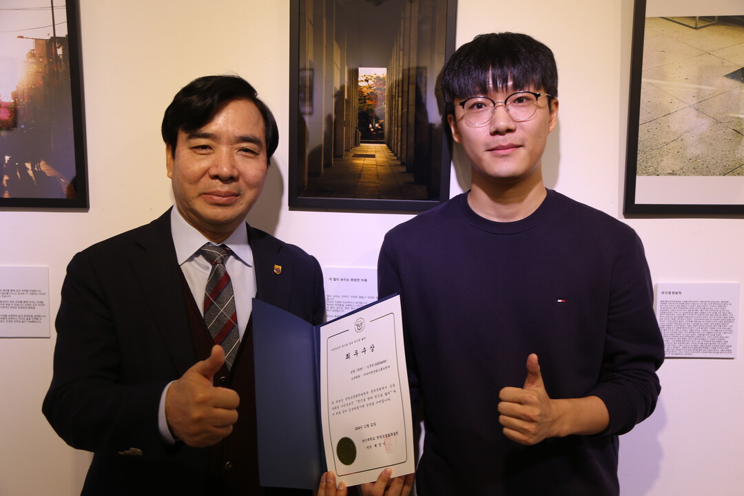 최우수상을 수상한 김준영 학생이 강성영 총장과 기념촬영을 하고 있다. |