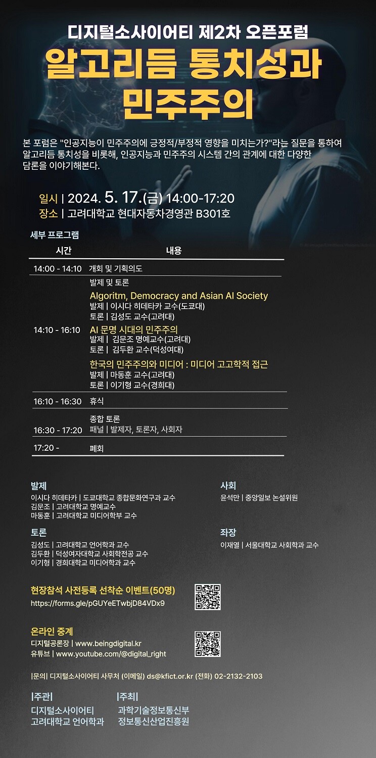 이번 포럼의 발제와 토론에는 기술·철학, 사회학, 언론학 분야 국내외 석학들이 참여한다. 이시다 히데타카 도쿄대 교수의 ‘Algoritm, Democracy and Asian AI Society’, 김문조 고려대 명예교수의 ‘AI 문명시대의 민주주의’, 마동훈 고려대 교수의 ‘한국의 민주주의와 미디어’ 등의 주제로 발제를 진행하고, 김성도 고려대 교수, 김두환 덕성여대 교수, 이기형 경희대 교수가 지정 토론자로 참여한다.