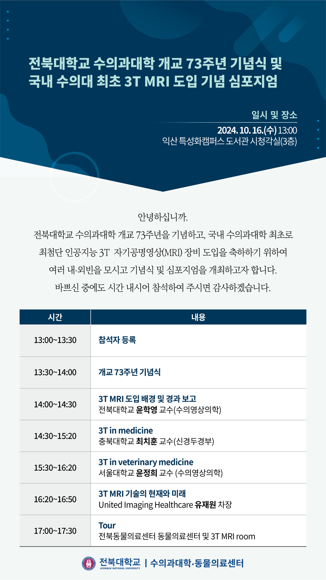 익산 특성화캠퍼스 도서관 일원에서 열리는 이번 개교 73주년 기념 학술제는 학생들을 위한 진로특강의 날 행사를 비롯해 대학원생들의 연구역량을 엿볼 수 있는 학술발표 경진대회(Research Fair), 개교 73주년 기념식을 통해 우수 구성원 시상, 그리고 국내 수의대 최초 3T MRI 장비 도입 기념 심포지엄 등 다채롭게 열린다.