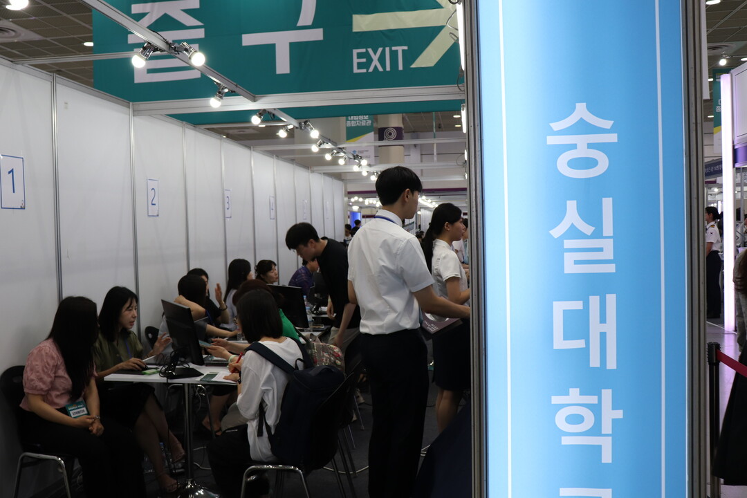 [대학저널 이선용 기자] 2025학년도 대입 수시모집을 앞두고 수험생과 학부모들이 입학 정보를 얻기 위해 발걸음을 재촉하고 있다. 이런 가운데 한국대학교육협의회는 수험생들의 궁금증 해소와 알찬 정보 제공을 위해 ‘2025학년도 수시 대학입학정보박람회’를 7월 25일부터 27일까지 3일간 서울 삼성동 코엑스에서 개최하고 있다. 2025학년도 수시 대학입학정보박람회는 지역 거점 국·공립대학, 수도권 대학 등 전국 149곳이 참가했으며, 수험생들은 대학별 입학전문가와 일대일 맞춤형 상담 진행할 수 있다. 사진은 숭실대학교 부스에서 입시 상담을 받고 있는 수험생들의 모습이다.