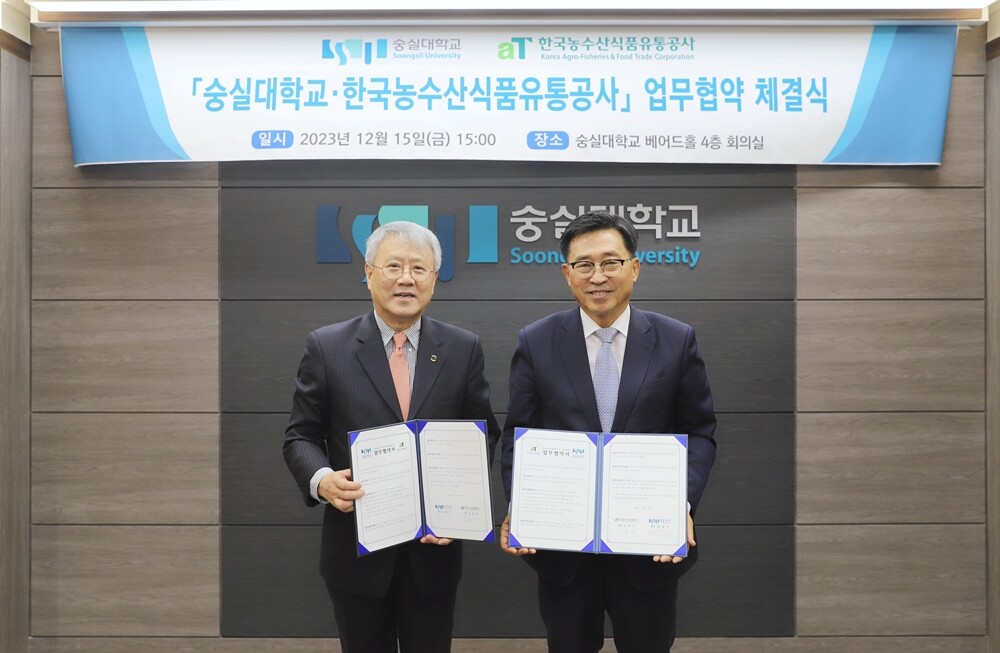 숭실대와 한국농수산식품유통공사가 15일 업무협약을 체결했다. 사진=숭실대 제공 |