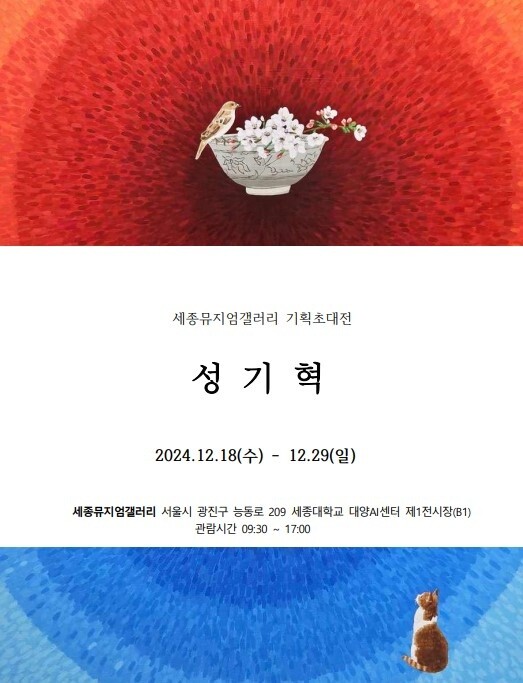세종뮤지엄갤러리 관계자는 "성 작가 작품의 풍부한 색채들은 어린시절 추억과 유희를 떠올리게 한다"며 "자연의 풍경, 새와 고양이, 물고기 등 우리 주변 속 생명과 존재의 관계를 재구성한 작품을 통해 새로운 시각적 경험을 하게 될 것"이라고 전했다.