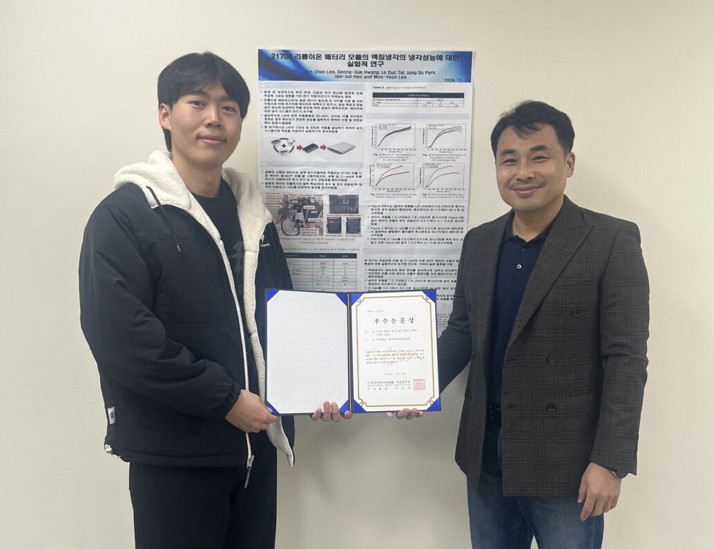 최근 제주 신라스테이에서 열린 이번 행사에서 동아대 이준찬 학생은 ‘Experimental Investigations on the Theraml Management Performance of Immersion Cooling for 21700 Lithum-ion Battery Module(21700 리튬이온 배터리 모듈의 액침냉각의 냉각성능에 대한 실험적 연구)’ 연구로 우수논문상을 수상했다.