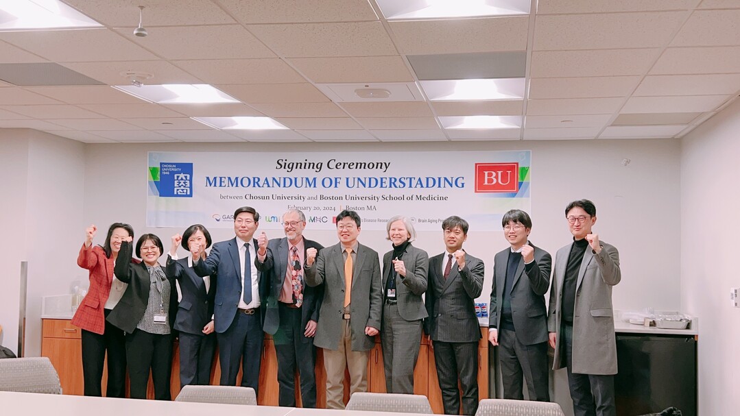 조선대 램프사업단과 보스턴 의과대학 관계자들이 MOU를 체결하고 기념촬영을 하고 있다. 사진=조선대 제공 |