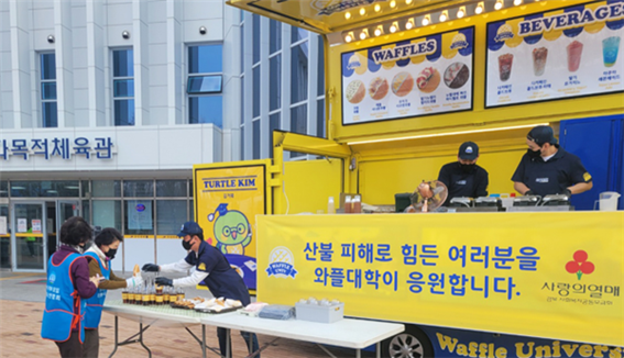카페 프랜차이즈 (주)와플대학이 산불 피해를 입은 안동지역 대피소(안동다목적체육관)에 와플트럭을 지원했다. 현장에서는 대피 주민, 산불 진화 인력, 자원봉사자들을 대상으로 와플과 음료를 제공했다.
