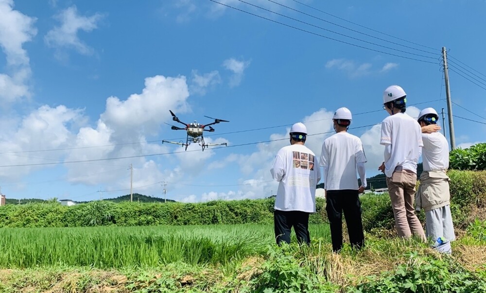 호남대 드론방제봉사단이 24일 전남 함평군 손불면에서 방제작업을 하고 있다. 사진=호남대 제공 |