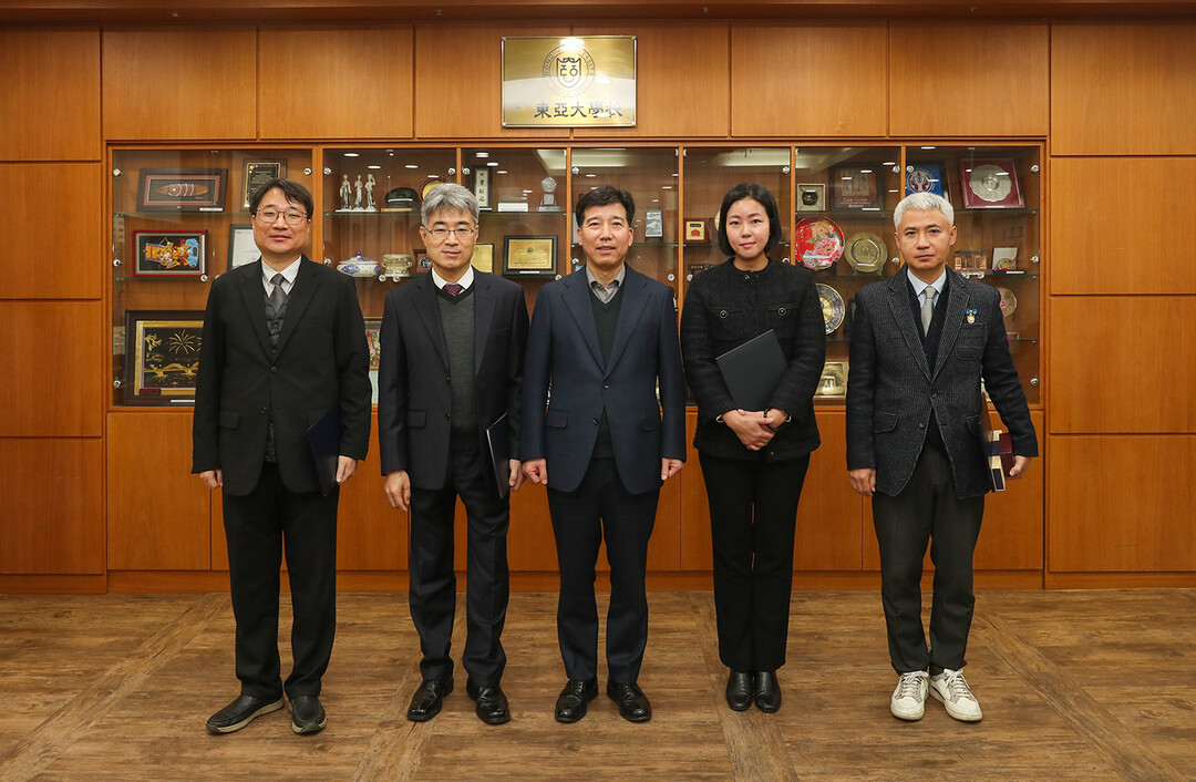 지난 5일 승학캠퍼스 총장실에서 열린 표창장 전수식. 왼쪽부터 이창훈 팀장, 권명수 과장, 이해우 총장, 홍서영 팀장, 최익준 과장. |