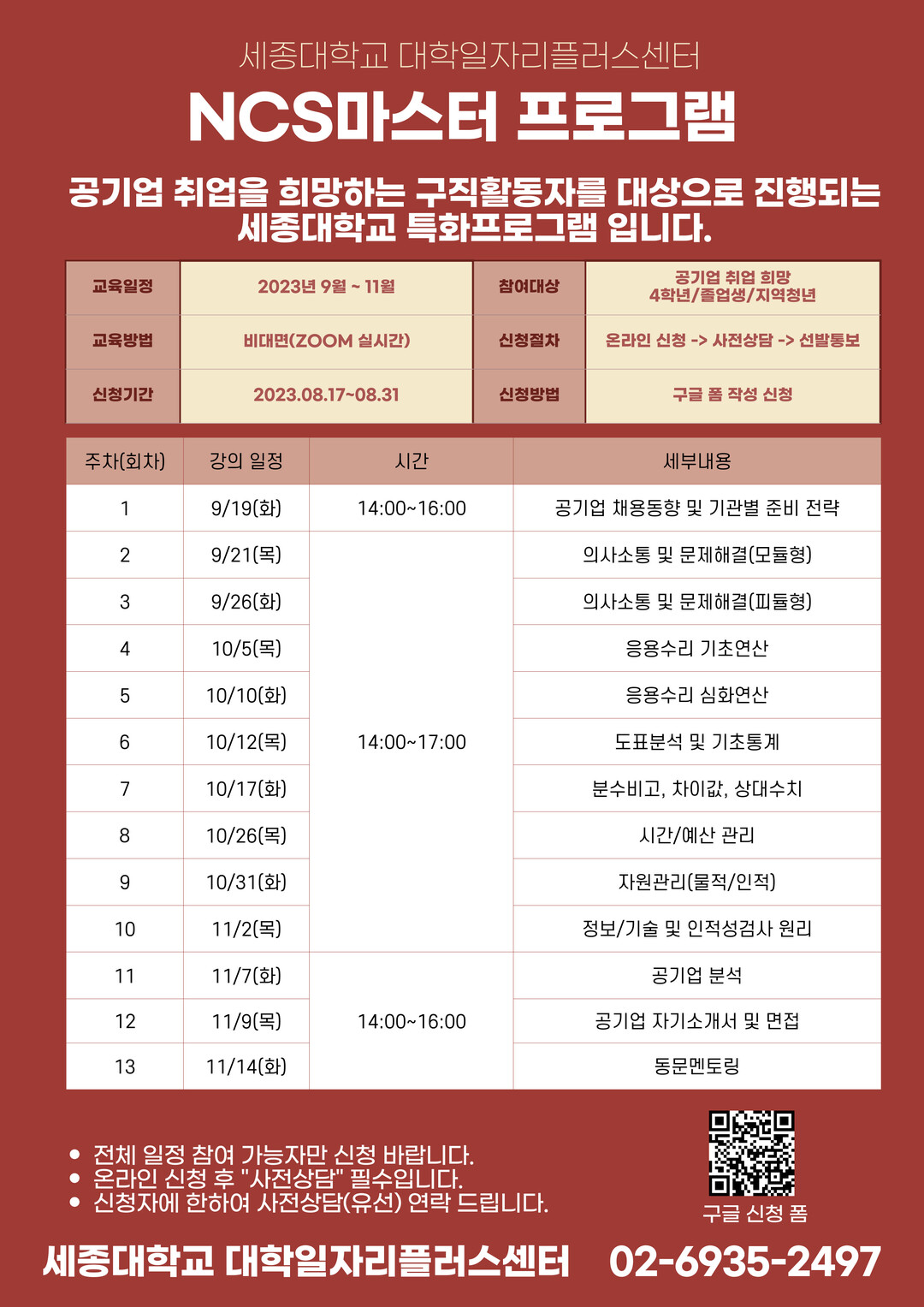 세종대 대학일자리플러스센터 관계자는 “공기업 채용에서 NCS 필기 시험 전형이 중요해지는 만큼, 이번 프로그램이 학생들의 NCS 필기 전형 대비와 취업에 실질적인 도움이 될 것으로 기대한다”고 말했다.