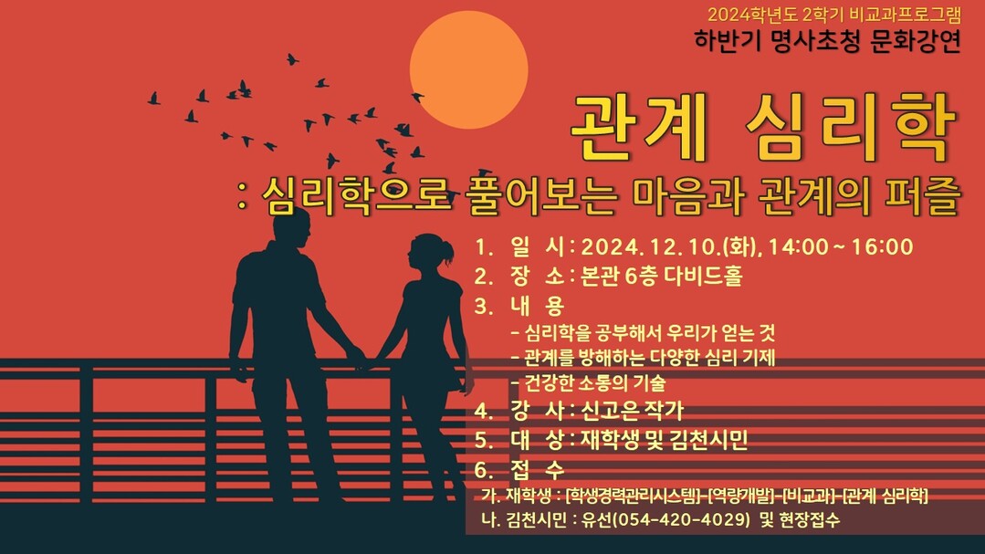 도서관 강좌는 김천대 본관 6층 다비드홀에서 진행되며, 이번 회차에서는 신고은 작가를 초청하여 “관계 심리학 : 심리학으로 풀어보는 마음과 관계의 퍼즐”을 주제로 심리학의 효용과 건강한 소통의 기술에 대하여 진행할 예정이다.