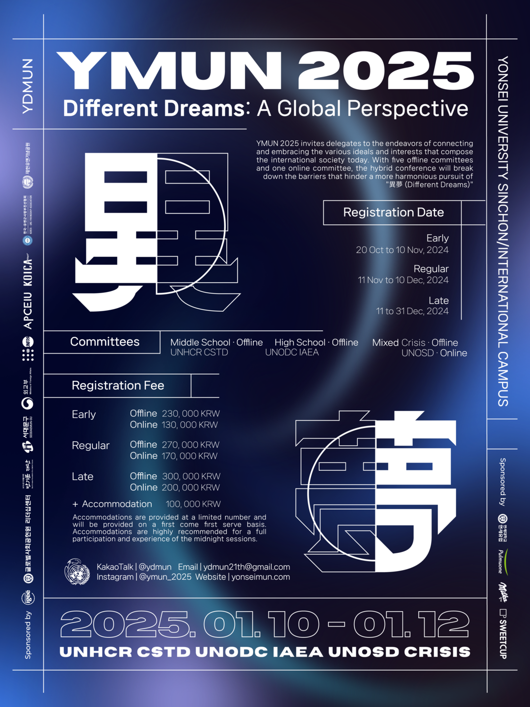 2008년 이후 16년 간 국내 최대 규모의 모의유엔 대회로서 명성을 이어온 YMUN은, 다가오는 1월, 또 한번 국제 무대로의 진출을 희망하는 국내외 중고등학생들에게 꿈을 펼칠 기회를 제공한다. 이번 행사의 주제는 ‘이몽異夢: 국제적 관점에서’ 로, 서로 다른 꿈들이 모여 소통하며 세계의 평화, 협력, 조화를 도모하는 것을 목표로 한다.