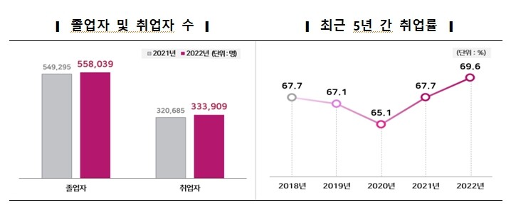 발표에 앞서 27일 공개한 교육부 자료에 의하면 2022년 2월 고등교육기관 졸업자(2021년 8월 졸업자 포함) 중 취업자는 33만 3,909명으로 취업대상자 47만 9,573명의 69.6% 수준이며 전년 대비 1.9%p 증가(67.7%, 2021.12.31. 기준)한 것으로 나타났다. 이는 2018년 이후 최근 5년 내 가장 높은 수치이다.