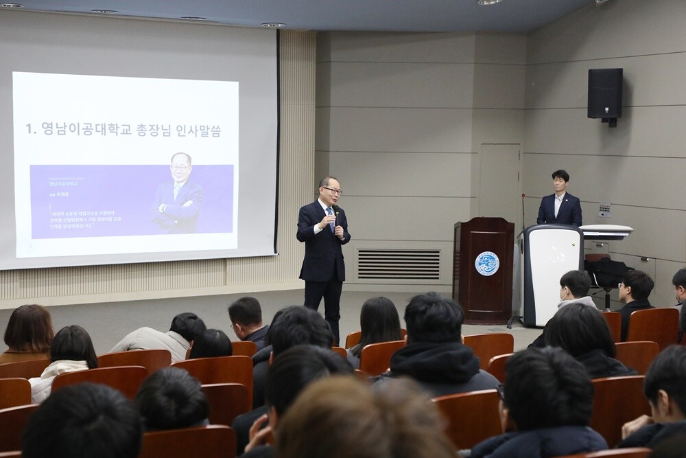 영남이공대 ‘전공 특화과정 Winter School 캠프’에서 이재용 총장이 축사를 하고 있다. 사진=영남이공대 제공 |