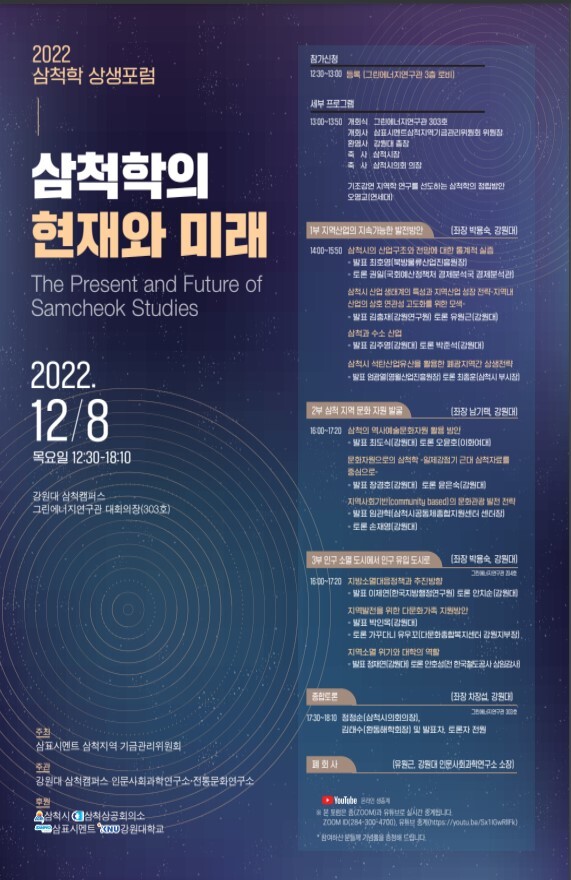 2부에서는 ‘삼척지역 문화자원 발굴’에 대해 최도식 강원대 교수, 장경호 강원대 선임연구원, 임관혁 삼척시공동체종합지원센터장이, 3부에서는 ‘인구소멸 도시에서 인구유입 도시로’에 대해 이제연 한국지방행정연구원, 박인옥 강원대 교수, 정재연 강원대 교수 등이 각각 발표한다.