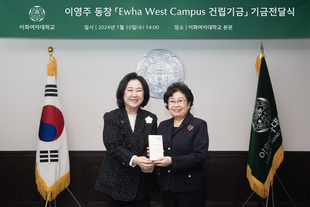 이화여대가 이영주 이화학당 이사로부터 ‘이화 웨스트 캠퍼스(Ewha West Campus) 건립기금’ 10억 원을 기부받는다. 사진=이화여대 제공 |