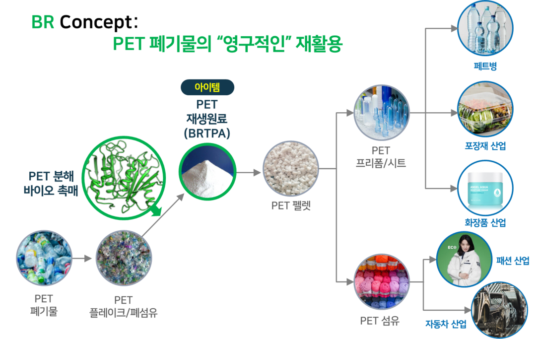 기존의 기계적 재활용(Mechanical Recycling, MR)과 화학적 재활용(Chemical recycling, CR)의 단점을 보완하는 바이오촉매 재활용(Biocatalytic recycling, BR)은 주변 온도(25~70℃)와 물속에서 작동해, PET에 선택적으로 반응하고 순수한 반응물을 생성한다. 첨단 기술이 집약된 바이오촉매 개발은 BR의 핵심으로, 인공적인 바이오촉매를 개발하기 위한 글로벌 경쟁이 치열한 상황이다.