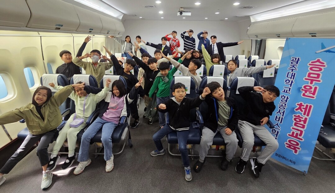 광주대 항공서비스학과가 광주효동초 4학년 학생 20여 명을 초청해 항공 직업 체험 프로그램을 실시했다. 사진=광주대 제공 |