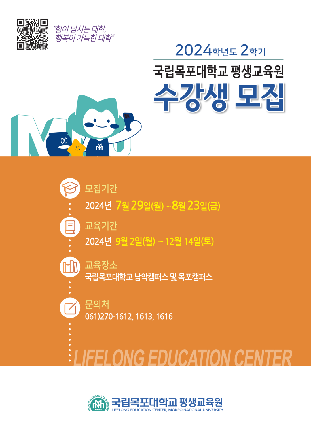 국립목포대 평생교육원 수강신청은 홈페이지, 전화 또는 방문접수로 가능하며, 자세한 내용은 국립목포대 평생교육원 행정실로 문의하면 된다.