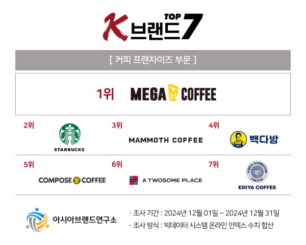 이번 ‘K-브랜드 톱7’ 커피 프랜차이즈 부문은 메가커피가 1위의 영예를 차지했으며, △2위 스타벅스 △3위 메머드커피 △4위 빽다방 △5위 컴포즈커피 △6위 투썸플레이스 △7위 이디야커피 등이 상위권에 이름을 올렸다.