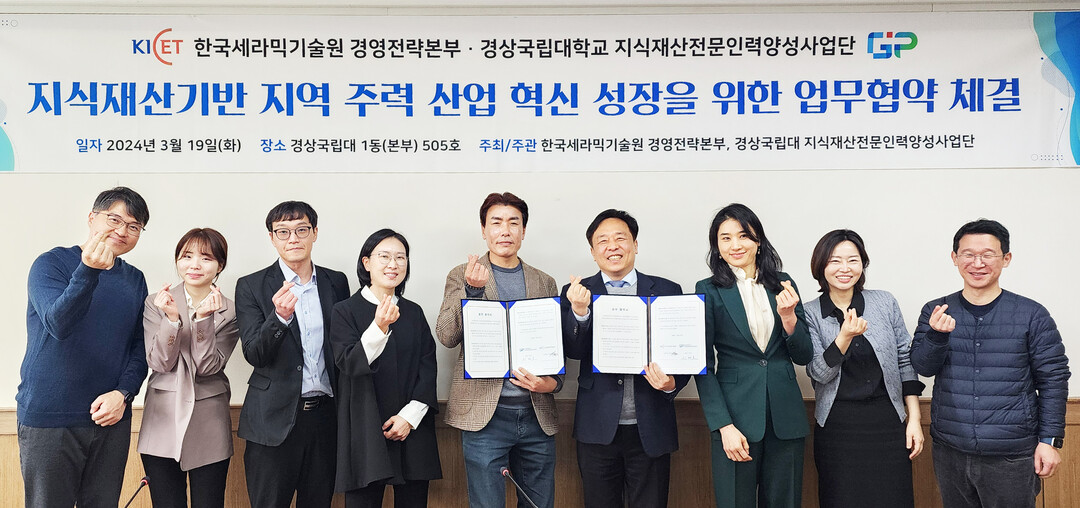 경상국립대 지식재산전문인력양성사업단과 한국세라믹기술원 경영전략본부는 지식재산 기반 지역 주력 산업 혁신 성장을 위한 업무협약을 체결했다. 사진=경상국립대 제공 |