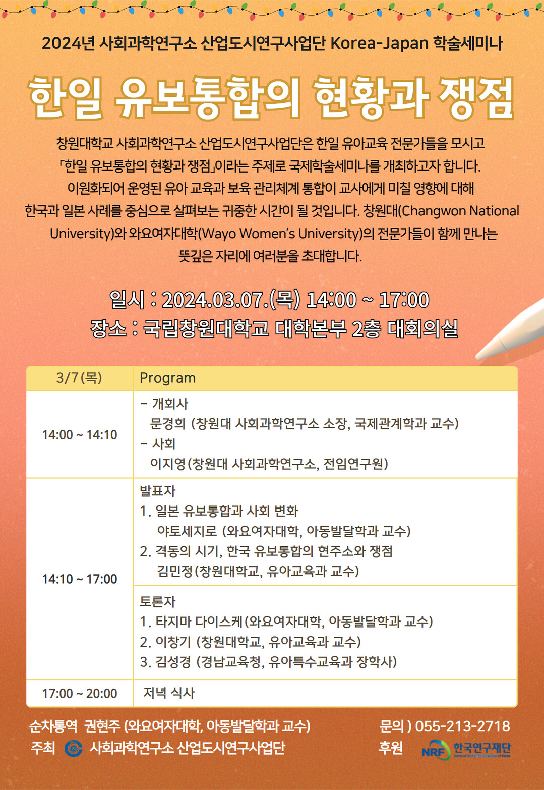 [대학저널 이선용 기자] 국립창원대학교 사회과학연구소 산업도시연구사업단이 7일 오후 2시 국립창원대 대학본부 2층 대회의실에서 한일 영·유아교육 전문가들을 초청, ‘한일 유보통합의 현황과 쟁점’이라는 주제로 학술세미나를 개최한다.