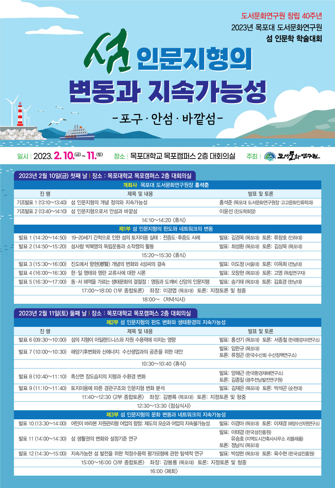 학술대회를 주관하는 목포대 도서문화연구원 홍석준 원장은 “섬 인문지형의 변동과 지속가능성에 대한 총체적이고 융합적인 접근이 제대로 이루어져 섬과 바다 세계의 판도 변화와 지속가능성을 진단하고 이에 대한 실제적이고 구체적인 실천 방안을 마련하고자 한다”고 말했다.