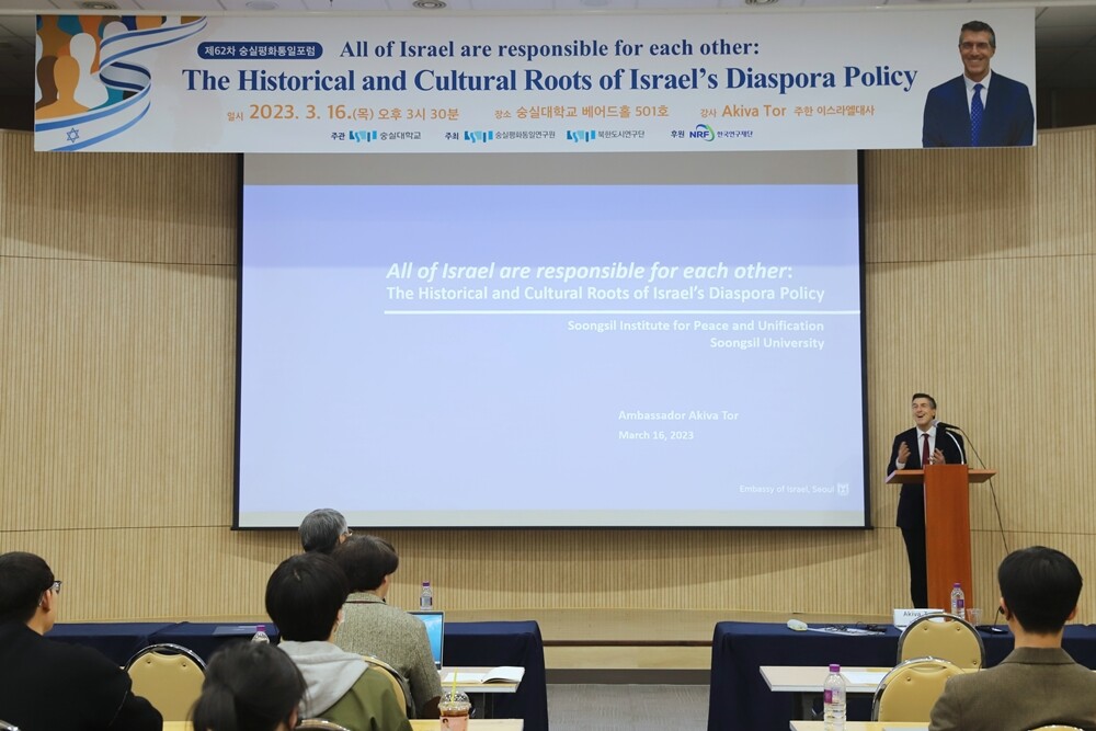 아키바 토르 주한 이스라엘 대사가 숭실대 숭실평화통일연구원이 주최한 ‘제62차 숭실평화통일포럼’에서 '이스라엘 디아스포라 정책의 역사적 · 문화적 뿌리'를 주제로 강연하고 있다.사진= 숭실대 제공 |