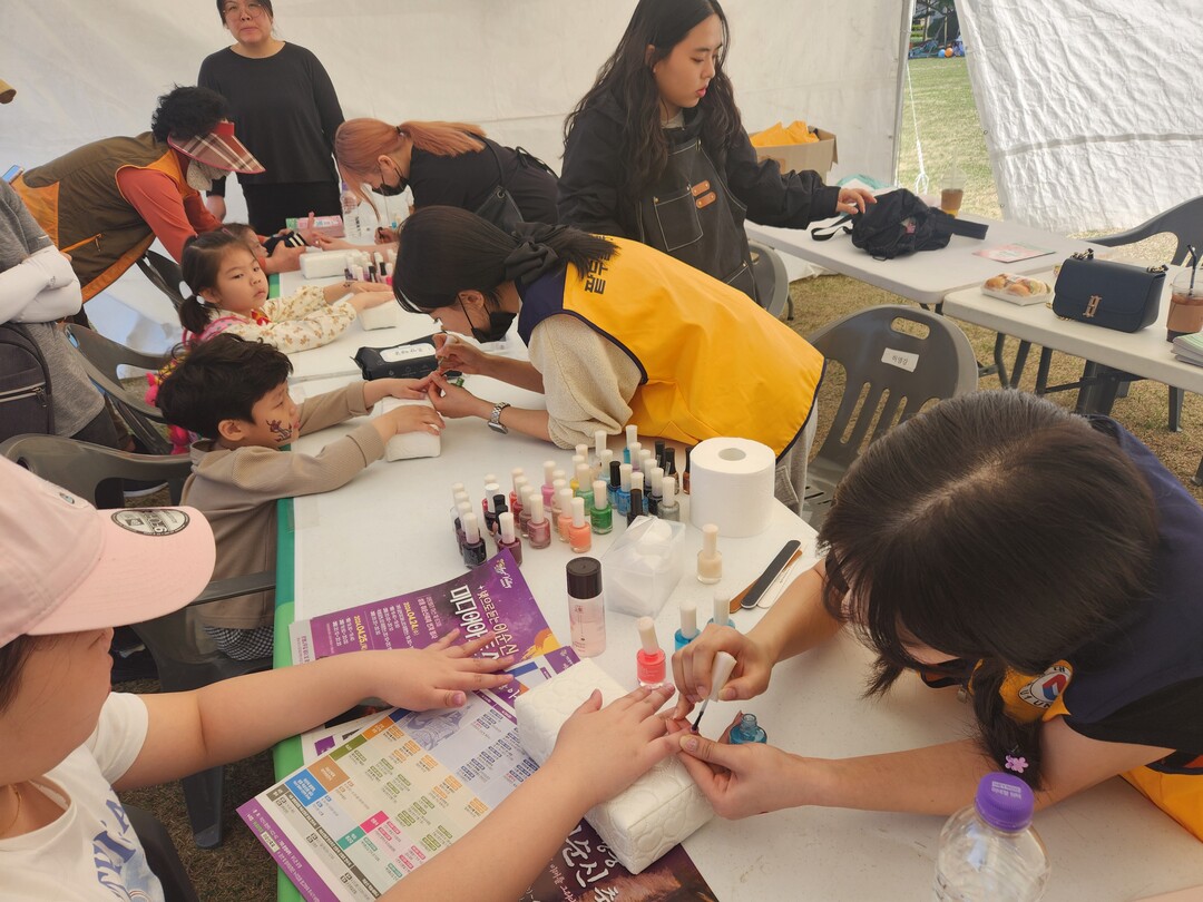 유원대 뷰티케어학과 재학생과 교직원들을 중심으로 구성된 ‘팥두알 사회봉사단’은 13일(토) 아산시 신정호 잔디광장 일원에서 개최된 ‘2024년 제7회 건강한한마당 건강부스’에 참여해 전공분야인 네일아트, 페이스페인팅 등을 지역주민들에게 무료로 제공해 큰 호응을 얻었다.