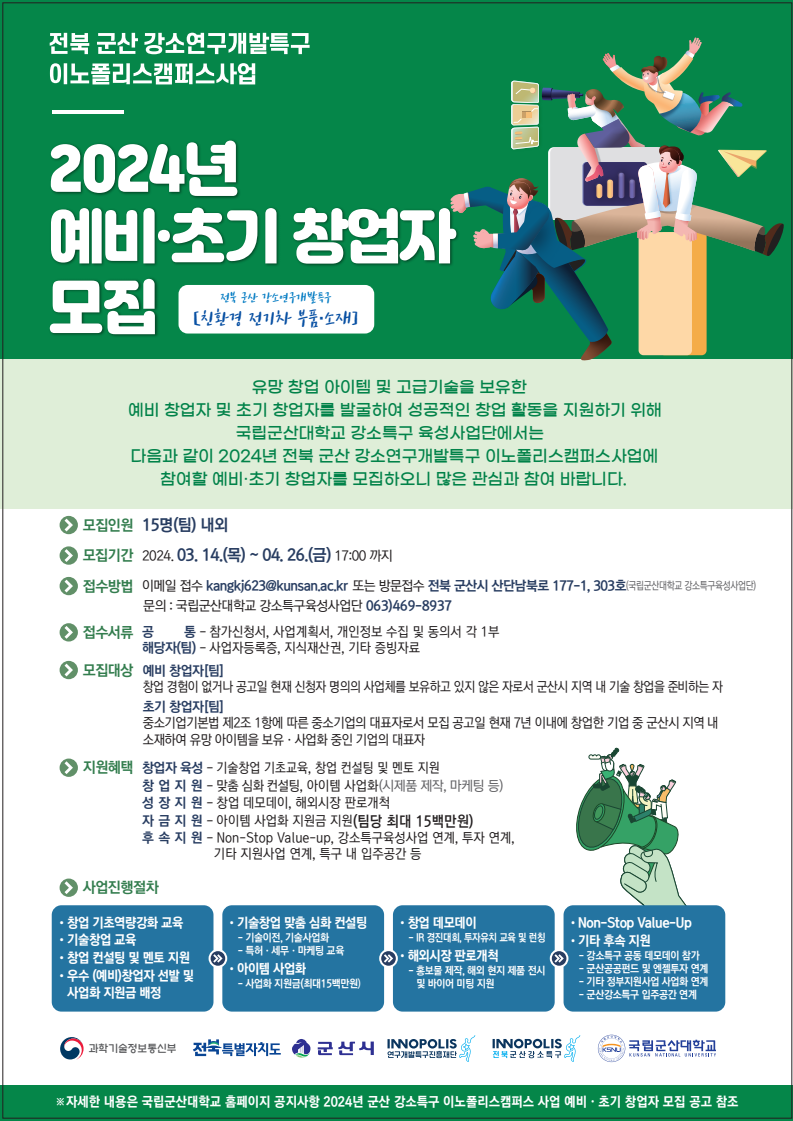 [대학저널 이선용 기자] 국립군산대학교 강소특구육성사업단이 2024년 강소특구 이노폴리스캠퍼스사업[군산특구]에 참여할 예비·초기 창업자를 오는 4월 26일까지 모집한다.