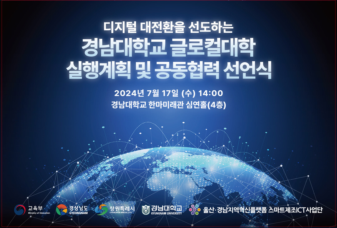 [대학저널 이선용 기자] 경남대학교가 오는 7월 17일 오후 2시 한마미래관 4층 심연홀에서 창원국가산업단지 디지털 대전환 실현을 이룰 글로컬 핵심 비전과 미래를 향한 대학의 역량과 의지를 알리는 ‘경남대학교 글로컬대학 실행계획 및 공동협력 선언식’을 개최한다.